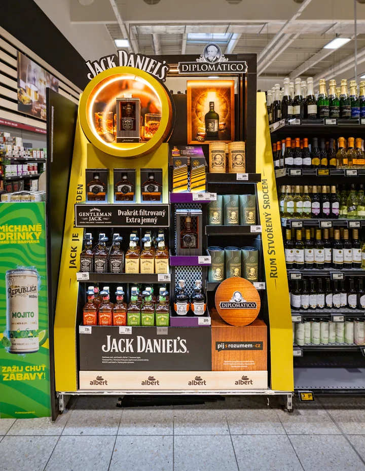 Při vytváření designu bylo záměrem podtrhnout prémiový charakter produktů. Designově jsme pracovali s ikonickými prvky obou značek – kontrastní černo-zlatou barevností Jack Daniel’s a výrazným vizuálem Diplomática. Dominantní grafika, prémiové světelné prvky a promyšlené rozvržení produktů zajistily vysokou viditelnost a snadnou orientaci zákazníků. Ti nosiče jistě zaznamenali v síti hypermarketů Albert. Novinkové hotpointy byly vyrobeny v celkovém nákladu padesáti kusů.