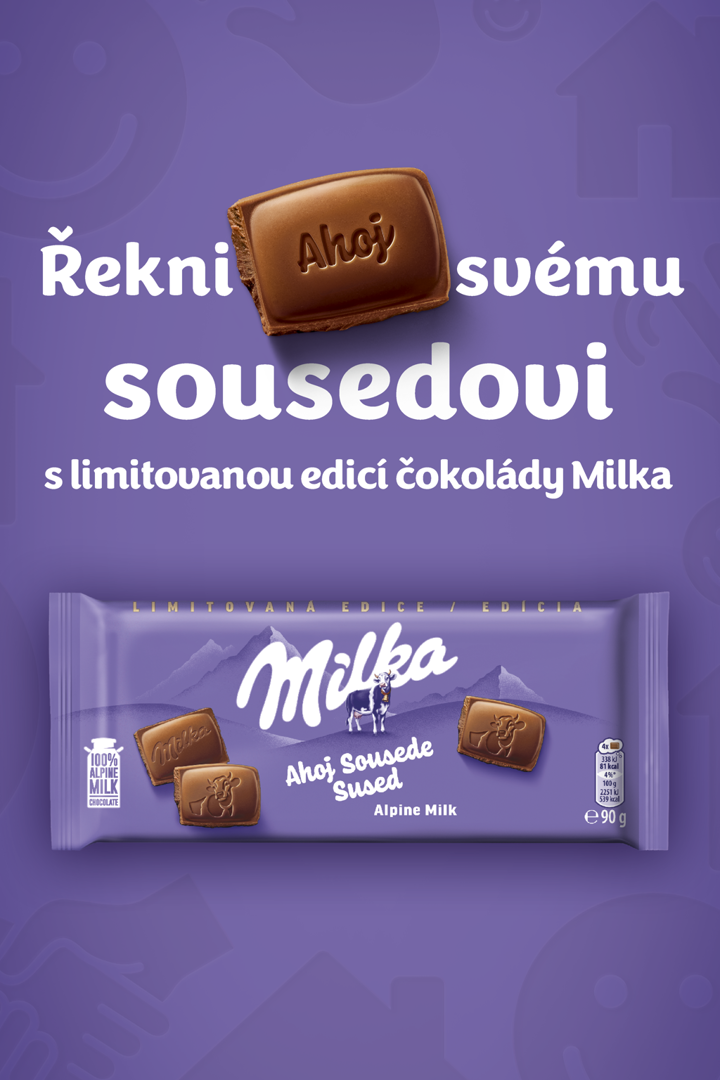 Speciálně pro tuto kampaň naleznete limitovanou edici čokolády Milka Alpine Milk 90 g s nápisem "Ahoj Sousede / Sused". Tato čokoláda není jen sladká pochoutka, ale také prostředek k jednoduchému, avšak hlubokému gestu, které dokáže prohřát celé sousedství.